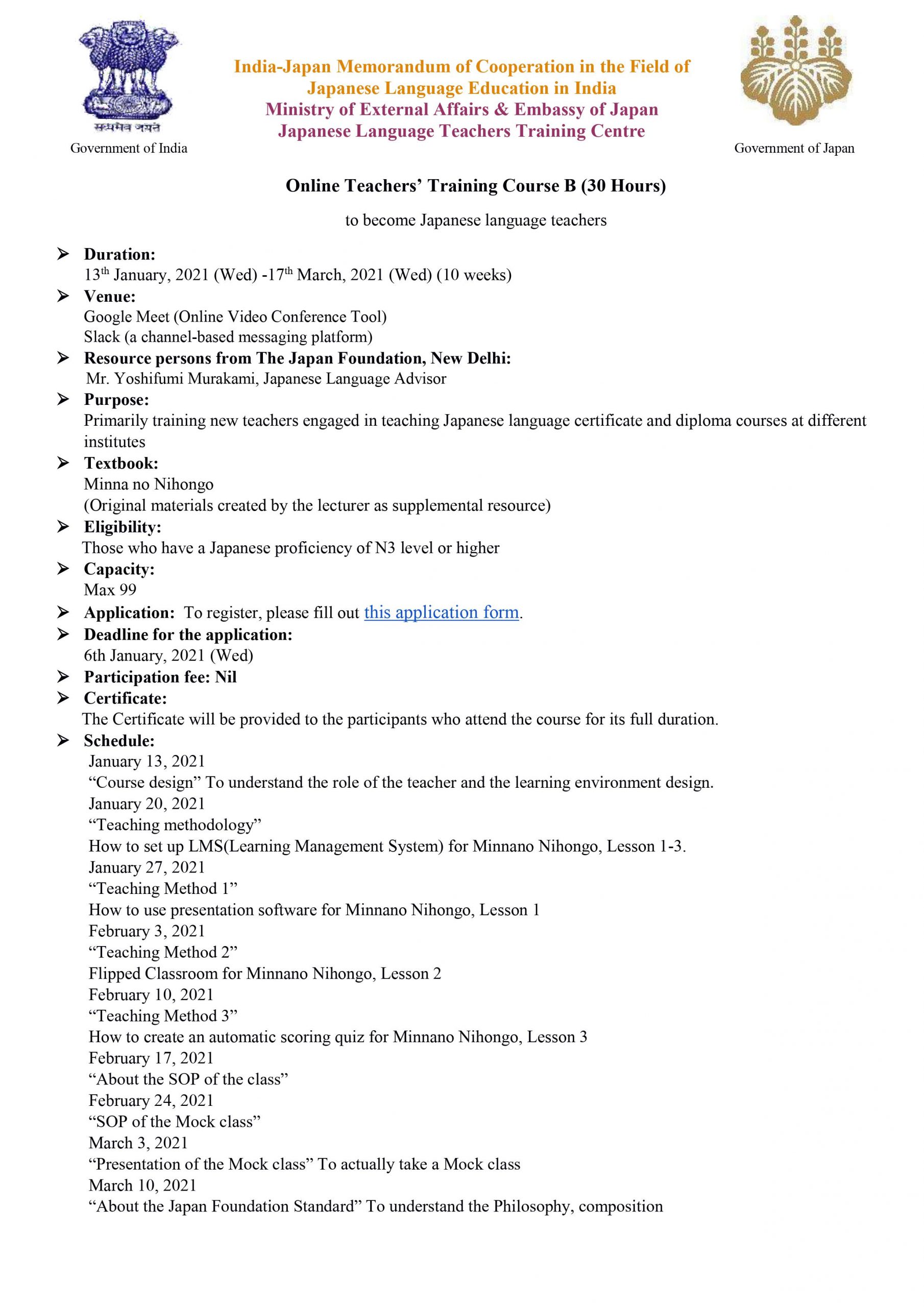 Online Teachers’ Training Course B (30 Hours) ✅ Duration: 13th January, 2021 (Wed) -17th March, 2021 (Wed) (10 weeks) ✅ Venue: Google Meet (Online Video Conference Tool) Slack (a channel-based messaging platform) ✅ Resource persons from The Japan Foundation, New Delhi: Mr. Yoshifumi Murakami, Japanese Language Advisor ✅ Purpose: Primarily training new teachers engaged in teaching Japanese language certificate […]
