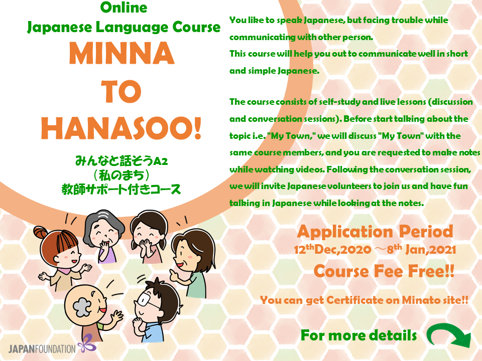 MINATO Online Japanese Language Course for South Asia Japanese language learners! To know more about this course, please read the flyer attached to this post. [For learners] みんなとはなそう!A2(わたしのまち) (Let’s speak together! A2(My town) Tutor Support Course) Are you struggling in speaking Japanese? Join this course and enhance your ability! The course contains self-study and live […]